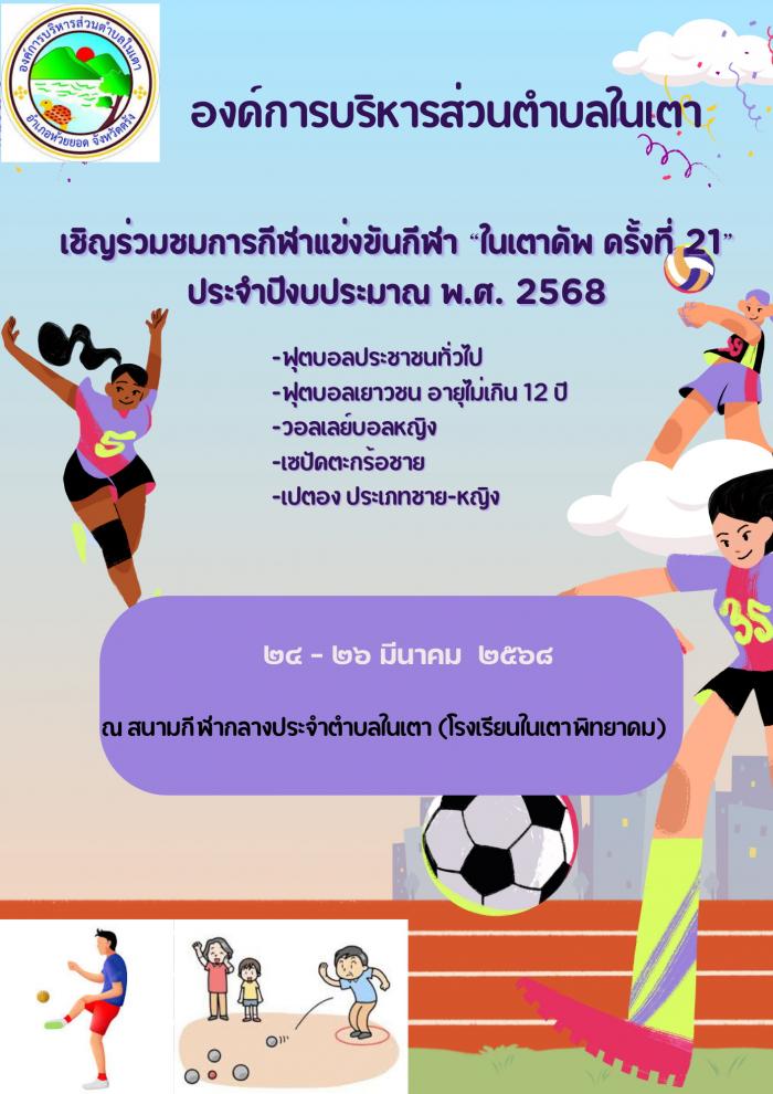 ประชาสัมพันธ์ แข่งขันกีฬา "ในเตาคัพ ครั้งที่ 21" ระหว่างวันที่ 24-26 มีนาคม 2568 ณ สนามกีฬาประจำตำบลในเตา (รร.ในเตาพิทยาคม)