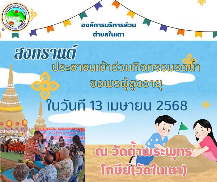 ประชาสัมพันธ์เข้าร่วมโครงการจัดงานประเพณีวันสงกรานต์รดน้ำผู้สูงอายุประจำปีงบประมาณพ.ศ.2568 วันอาทิตย์. ที่13 เมษายน 2568 ณ วัดถ้ำพระพุทธโกษีย์(วัดในเตา) **ผู้สูงอายุที่จะเข้าร่วมสามารถแจ้งรายชื่อได้ที่สมาชิกอบต. และที่ประธานชมรมผู้สูงอายุ ผอ.เรืองชัย ช่วยจันทร์ ติดต่อสอบถาม. 0980146989. เอ กองการศึกษาฯ