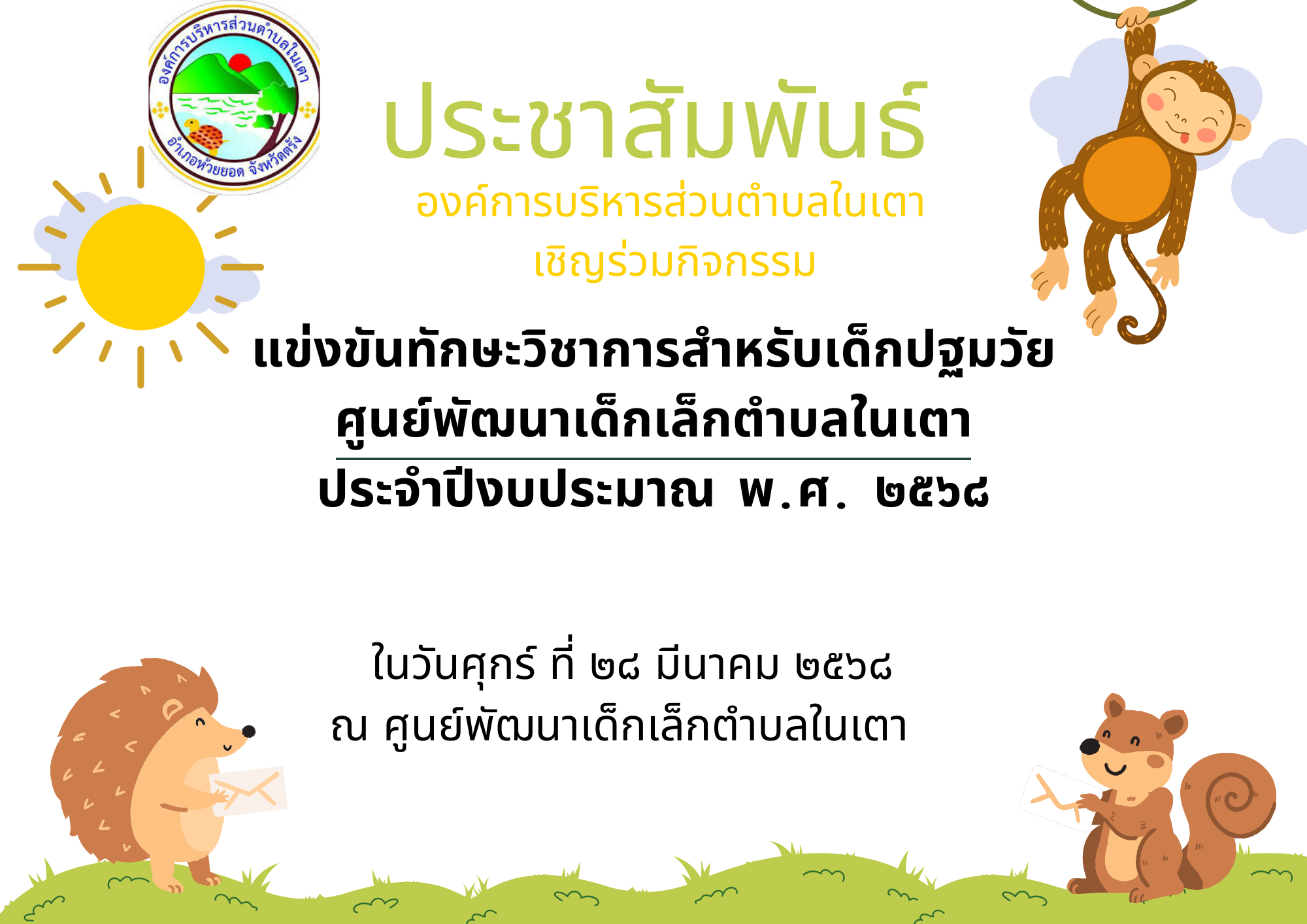 เชิญร่วมกิจกรรมแข่งขันทักษะทางวิชาการสำหรับเด็กปฐมวัย วันศุกร์ ที่ 28 มีนาคม 2568 ณ ศูนย์พัฒนาเด็กเล็กตำบลในเตา