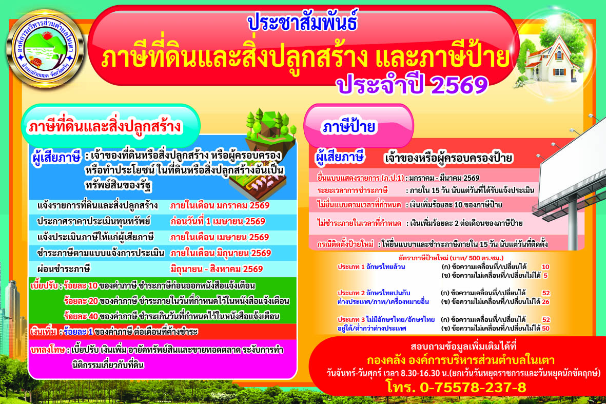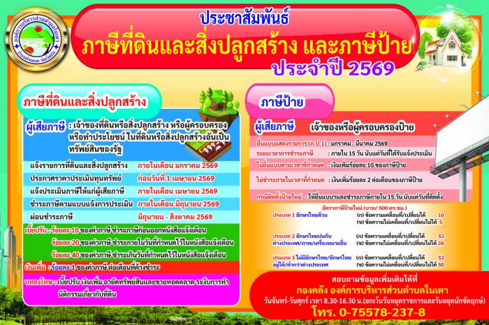 ประชาสัมพันธ์การจัดเก็บภาษีที่ดินและสิ่งปลูกสร้าง และภาษีป้ายประจำปี 2569