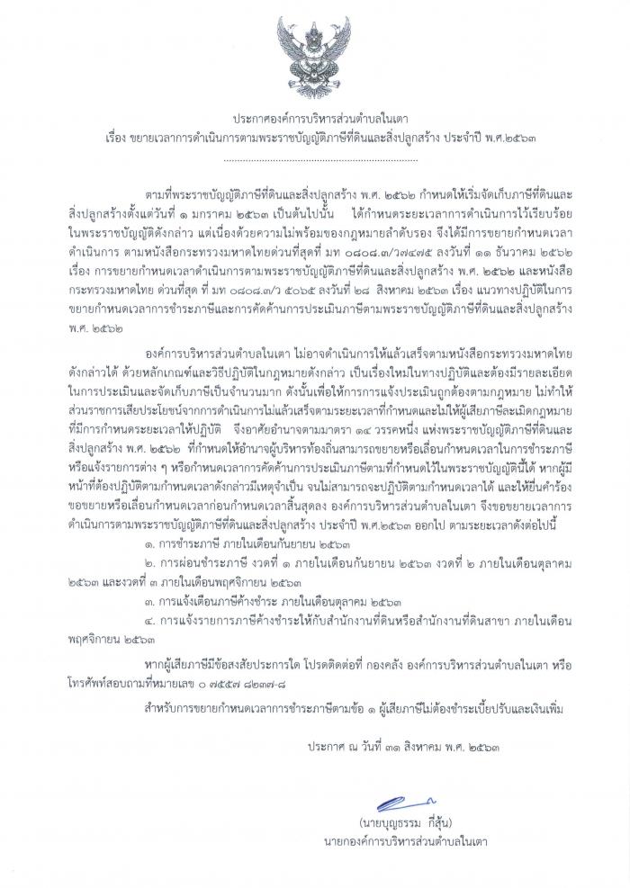 ประกาศองค์การบริหารส่วนตำบลในเตา เรื่อง ขยายเวลาการดำเนินการตามพระราชบัญญัติภาษีที่ดินและสิ่งปลูกสร้าง ประจำปี พ.ศ.2563