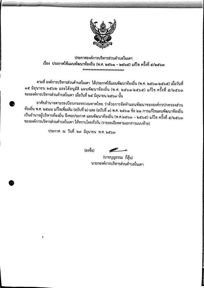 ประกาศใช้แผนพัฒนาท้องถิ่น (พ.ศ. 2561-2565) แก้ไข ครั้งที่ 5 2563